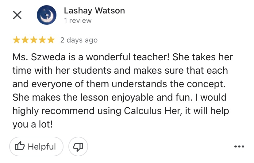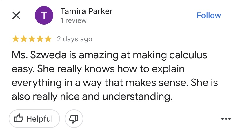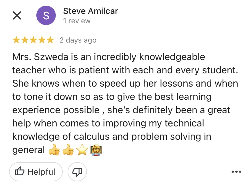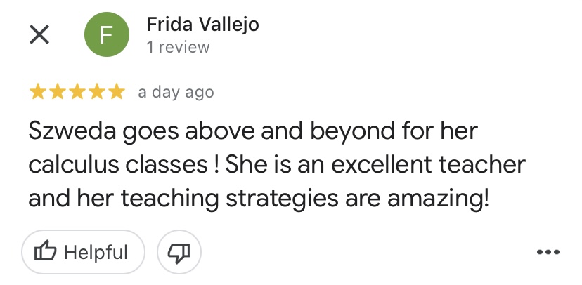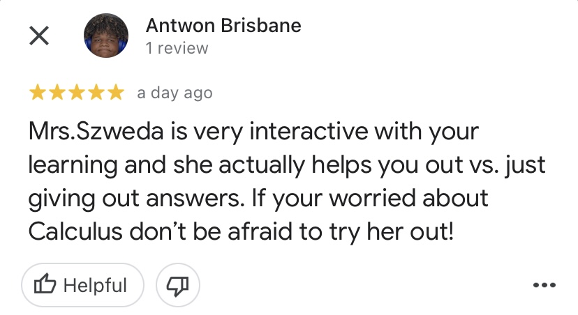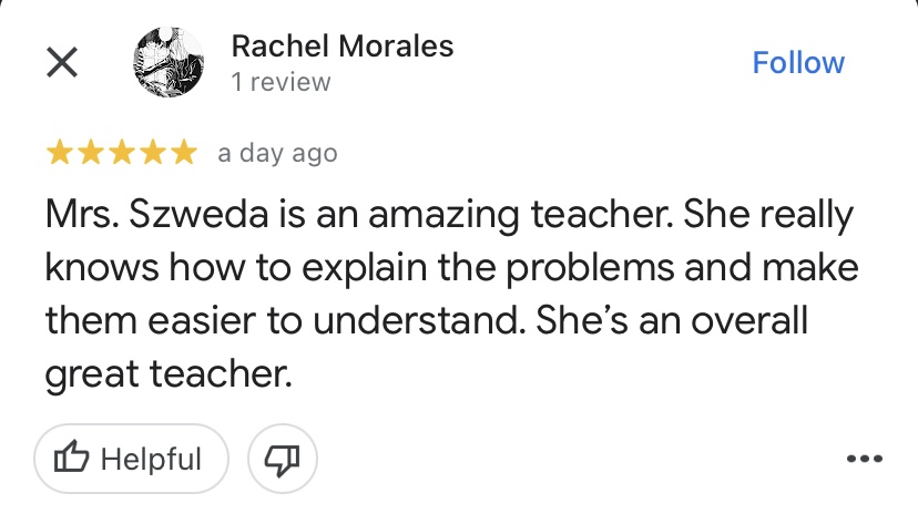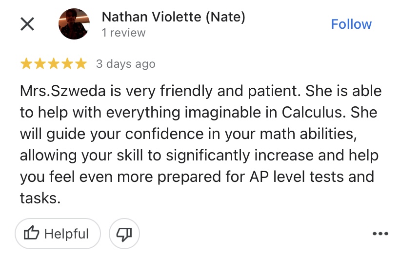 "Mrs. Szweda is a very helpful teacher and tutor. She always stops after each new rule or lesson and asks if there are any questions and if anyone does have any, she will help them out until they understand. She makes it known that asking questions are never a bad thing and pushes us to ask more even if we get it but are slightly confused. She wants us to fully understand Calculus and I have been because of her. "