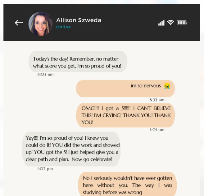 “With Allison and the AP Accelerator program, you’ll feel like someone has your back at all times and never feel defeated ever again! I never realized how much confidence that gave me. I am so thankful for Allison and her program because it kept my dreams alive.”